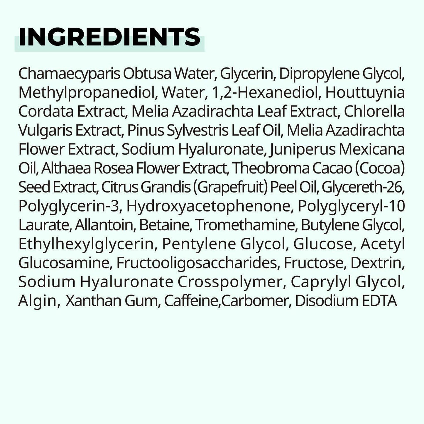 Cypress Water (81%), Glycerin, Dipropylene Glycol, Methylpropanediol, Purified Water, 1,2-Hexanediol, Yakushi Extract (1000Ppm), Indian Mulberry Leaf Extract, Chlorella Vulgaris Extract, Guzo Tree Leaf Oil, Indian Mulberry Flower Extract, Sodium Hyaluronate, Mexican Juniper Oil, Hollyhock Extract, Cacao Seed Extract, Tangerine Peel Oil, Glycereth-26, Polyglycerin-3, Hydroxyacetophenone, Polyglyceryl-10 Laurate, Allantoin, Betaine, Tromethamine, Butylene Glycol, Ethylhexyl Glycerin, Pentylene Glycol, Glucose, Acetylglucosamine, Fructooligosaccharide, Fructose, Dextrin, Sodium Hyaluronate Crosspolymer, Caprylyl Glycol, Algin, Xanthan Gum, Caffeine, Carbomer, Disodium EDTA.
