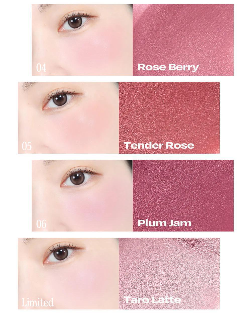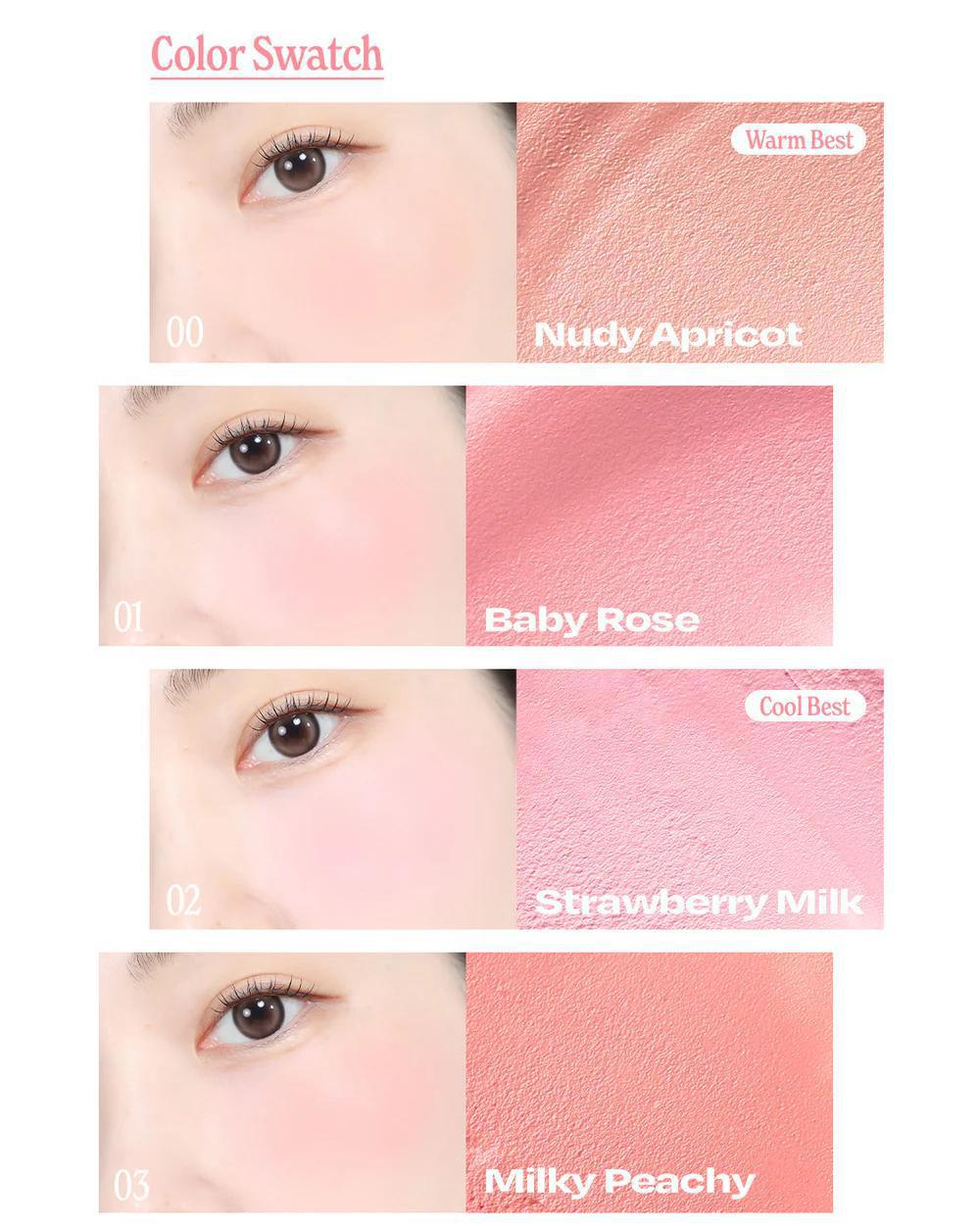 Available in 8 shades: 00 Nudy Apricot, 01 Baby Rose, 02 Strawberry Milk, 03 Milky Peach, 04 Rose Berry, 05 Tender Rose, 06 Plum Jam, 07 Taro Latte