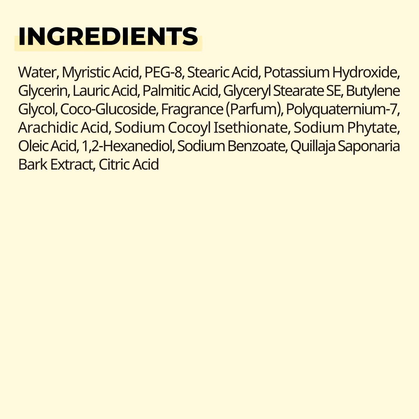 Water, Myristic Acid, PEG-8, Stearic Acid, Potassium Hydroxide, Glycerin, Lauric Acid, Palmitic Acid, Quillaza Skin Extract, Butylene Glycol, Coco-Glucoside, Glyceryl Stearate SE, Polyquaternium-7, Arachidic Acid, Sodium Cocoyl Isethionate, Sodium Phytate, Oleic Acid, 1,2-Hexanediol, Citric Acid, Sodium Benzoate, Fragrance