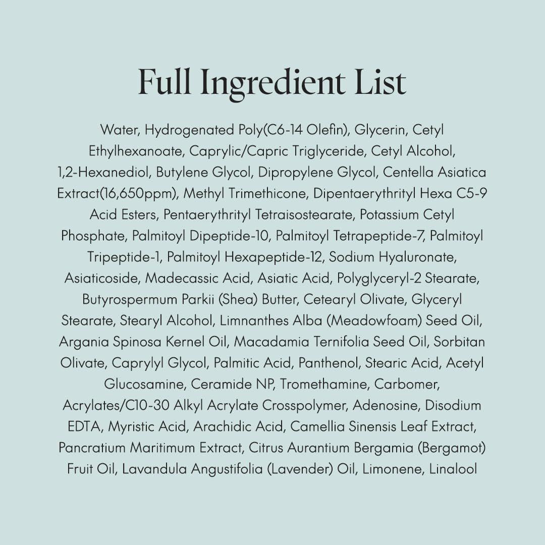 Water, Hydrogenated Poly(C6-14 Olefin), Glycerin, Cetyl Ethylhexanoate, Caprylic/Capric Triglyceride, Cetyl Alcohol, 1,2-Hexanediol, Butylene Glycol, Dipropylene Glycol, Centella Asiatica Extract(16,650ppm), Methyl Trimethicone, Dipentaerythrityl Hexa C5-9 Acid Esters, Pentaerythrityl Tetraisostearate, Potassium Cetyl Phosphate, Palmitoyl Dipeptide-10, Palmitoyl Tetrapeptide-7, Palmitoyl Tripeptide-1, Palmitoyl Hexapeptide-12, Sodium Hyaluronate, Asiaticoside, Madecassic Acid, Asiatic Acid, Polyglyceryl-2 Stearate, Butyrospermum Parkii (Shea) Butter, Cetearyl Olivate, Glyceryl Stearate, Stearyl Alcohol, Limnanthes Alba (Meadowfoam) Seed Oil, Argania Spinosa Kernel Oil, Macadamia Ternifolia Seed Oil, Sorbitan Olivate, Caprylyl Glycol, Palmitic Acid, Panthenol, Stearic Acid, Acetyl Glucosamine, Ceramide NP, Tromethamine, Carbomer, Acrylates/C10-30 Alkyl Acrylate Crosspolymer, Adenosine, Disodium EDTA, Myristic Acid, Arachidic Acid, Camellia Sinensis Leaf Extract, Pancratium Maritimum Extract, Citrus Aurantium Bergamia (Bergamot) Fruit Oil, Lavandula Angustifolia (Lavender) Oil, Limonene, Linalool