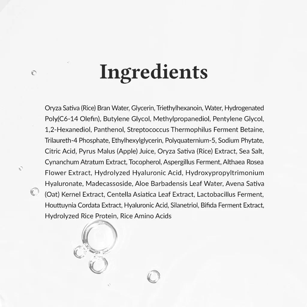 Oryza Sativa (Rice) Bran Water, 1,2-Hexanediol, Triethylhexanoin, Glycerin, Hydrogenated Poly(C6-14 Olefin), Tocopherol, Water, Butylene Glycol, Methylpropanediol, Pentylene Glycol, Streptococcus Thermophilus Ferment, Pyrus Malus (Apple) Juice, Panthenol, Hydrolyzed Hyaluronic Acid, Polyquaternium-51, Betaine, Trilaurate-4 Phosphate, Cynanchum Atratum Extract, Althaea Rosea Flower Extract, Oryza Sativa (Rice) Extract, Sea Salt, Aspergillus Ferment, Sodium Phytate, Citric Acid, Madecassoside, Hydroxypropyltrimonium Hyaluronate, Centella Asiatica Leaf Extract, Houttuynia Cordata Extract, Aloe Barbadensis Leaf Water, Bifida Ferment Extract, Hyaluronic Acid, Silanetriol, Avena Sativa (Oat) Kernel Extract, Lactobacillus Ferment, Hydrolyzed Rice Protein, Rice Amino Acids