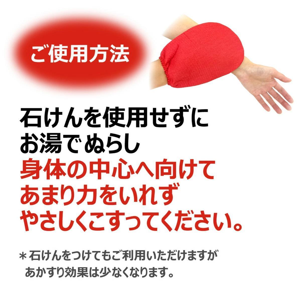 Specially processed rayon yarn shrinks when soaked in water or hot water. This shrinking fiber increases irritation to the skin, scrubbing away dirt and dead skin cells. Easy-to-use glove type. It is more effective to avoid using soap, as it reduces friction.