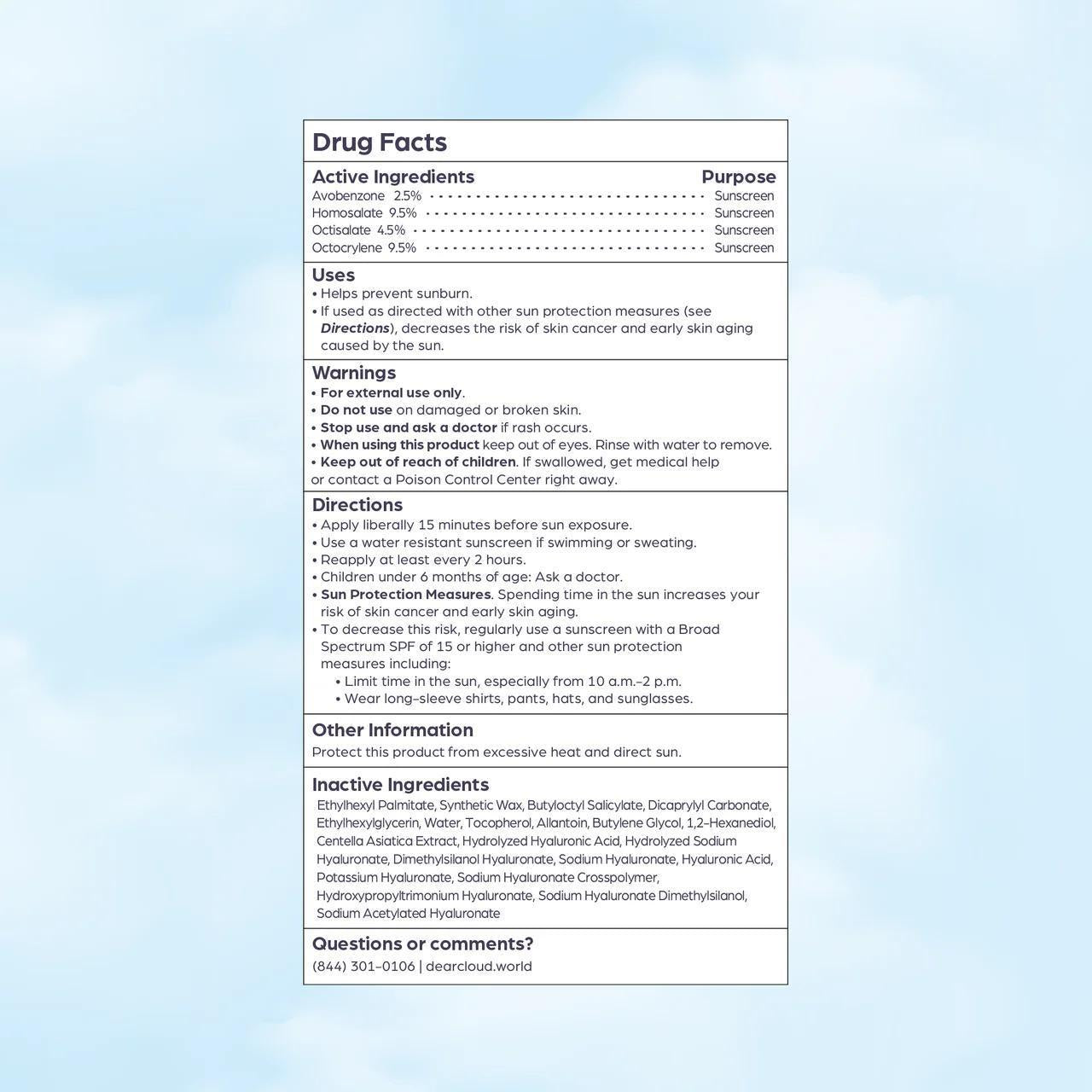 Inactive Ingredients: Ethylhexyl Palmitate, Synthetic Wax, Butyloctyl Salicylate, Dicaprylyl Carbonate, Ethylhexylglycerin, Water, Tocopherol, Allantoin, Butylene Glycol, 1,2-Hexanediol, Centella Asiatica Extract, Hydrolyzed Hyaluronic Acid, Hydrolyzed Sodium Hyaluronate, Dimethylsilanol Hyaluronate, Sodium Hyaluronate, Hyaluronic Acid, Potassium Hyaluronate, Sodium Hyaluronate Crosspolymer, Hydroxypropyltrimonium Hyaluronate, Sodium Hyaluronate Dimethylsilanol, Sodium Acetylated Hyaluronate