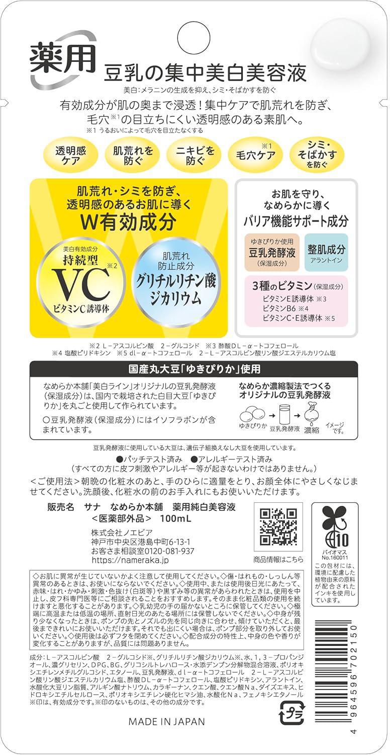 Prevents rough skin, treats pores*1, and whitens*2! This soy milk medicated whitening serum contains two active ingredients and three vitamins.