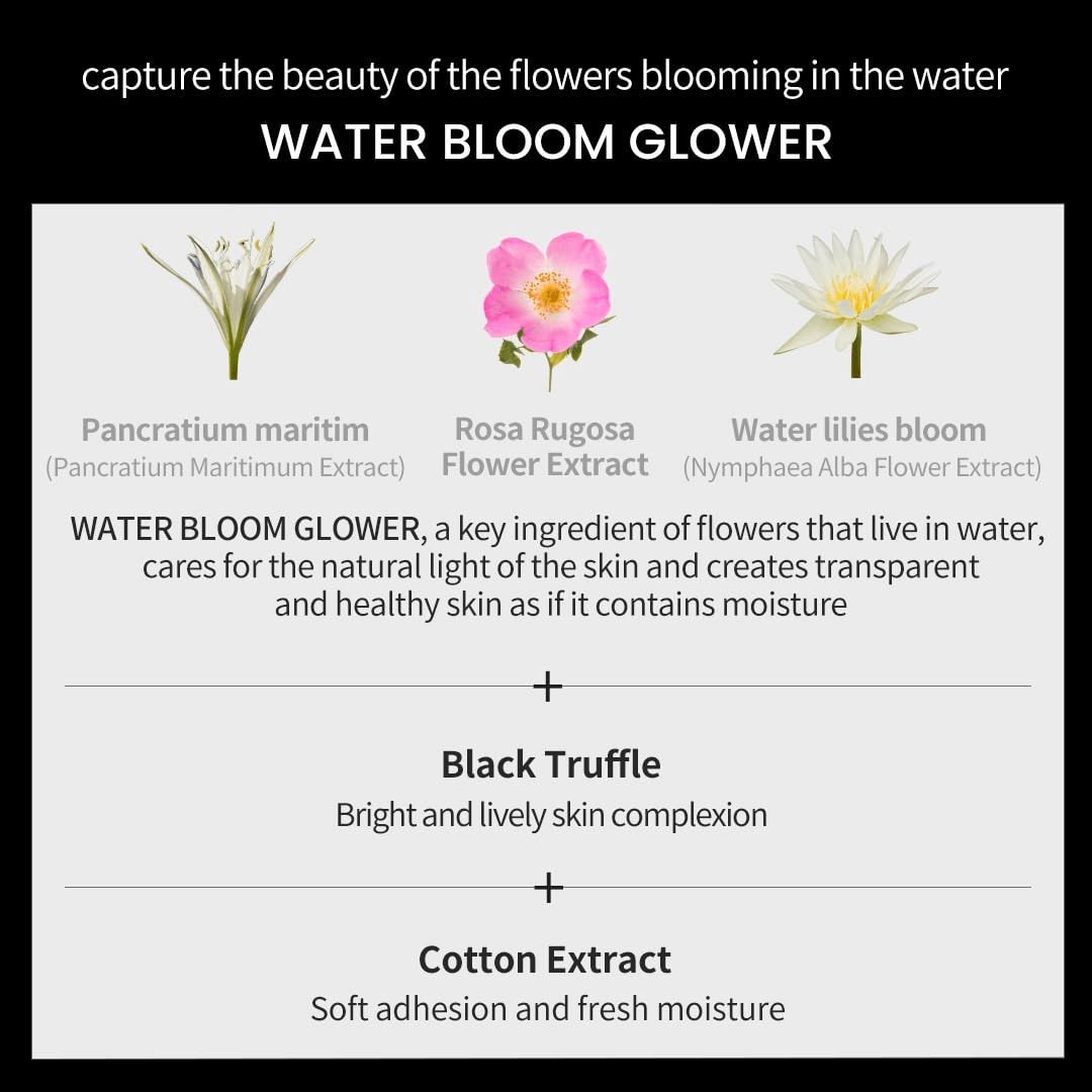 Water, cyclopentasiloxane, titanium oxide, ethylhexyl methoxycinnamate, DPG, methyl trimethicone, zinc oxide, polymethyl methacrylate, BG, lauryl PEG-8, dimethicone, phenylbenzimidazole sulfonic acid, niacinamide, nylon-12, TEA, cetyl PEG/PPG-10/1, dimethicone, sodium chloride, propanediol, polyglyceryl methacrylate, sorbitan sesquioleate, purslane extract, panthenol, disiloxane, iron oxide, disteardimonium hectorite, PG, Sodium benzoate, (dimethicone/methicone) copolymer, lauroyl lysine, tocopheryl acetate, (trimethylsiloxysilicate/dimethiconol) crosspolymer, hydroxide AI, dimethicone crosspolymer, iron oxide, triethoxycaprylylsilane, potassium sorbate, beeswax , glycerin, rugosa extract, fragrance, polyhydroxystearic acid, adenosine, palmitoylproline Na, EDTA-2Na, ethylhexyl palmitate, isopropyl myristate, isostearic acid, lecithin, propylene carbonate, iron oxide, polyglyceryl-3 polyricinoleate, hyaluron Acid, Hydrolyzed Hyaluronic Acid, Sodium Hyaluronate, 1,2-Hexanediol, Trimethylsiloxysilicic Acid, Aureopasidium Pullulans Culture, White Banana Cotton Extract, Pancratium Maritimum Extract, Nymphaea Alba Flower Extract, Ethylhexylglycerin, truffle extract